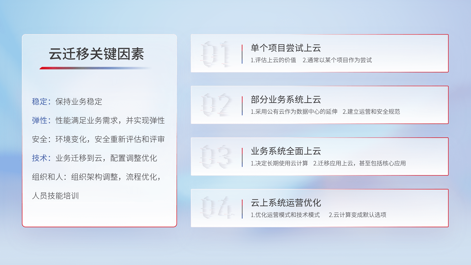 结合实际业务,,,,从规划设计、、云平台选型、、、、云原生改造、、数据迁移、、、、集成交付,,,迁移全过程为客户识别最佳上云路径,,,做好风险识别管理,,,,设计网络架构、、、、身份权限、、、安全审计合规、、、、操作审计、、、、日志审计、、、、监控告警策略、、、、多站点容灾设计等,,对云上基础设施进行整体规划,,提升IT治理水平,,,以满足弹性、、高可用、、高性能的需求。。。。