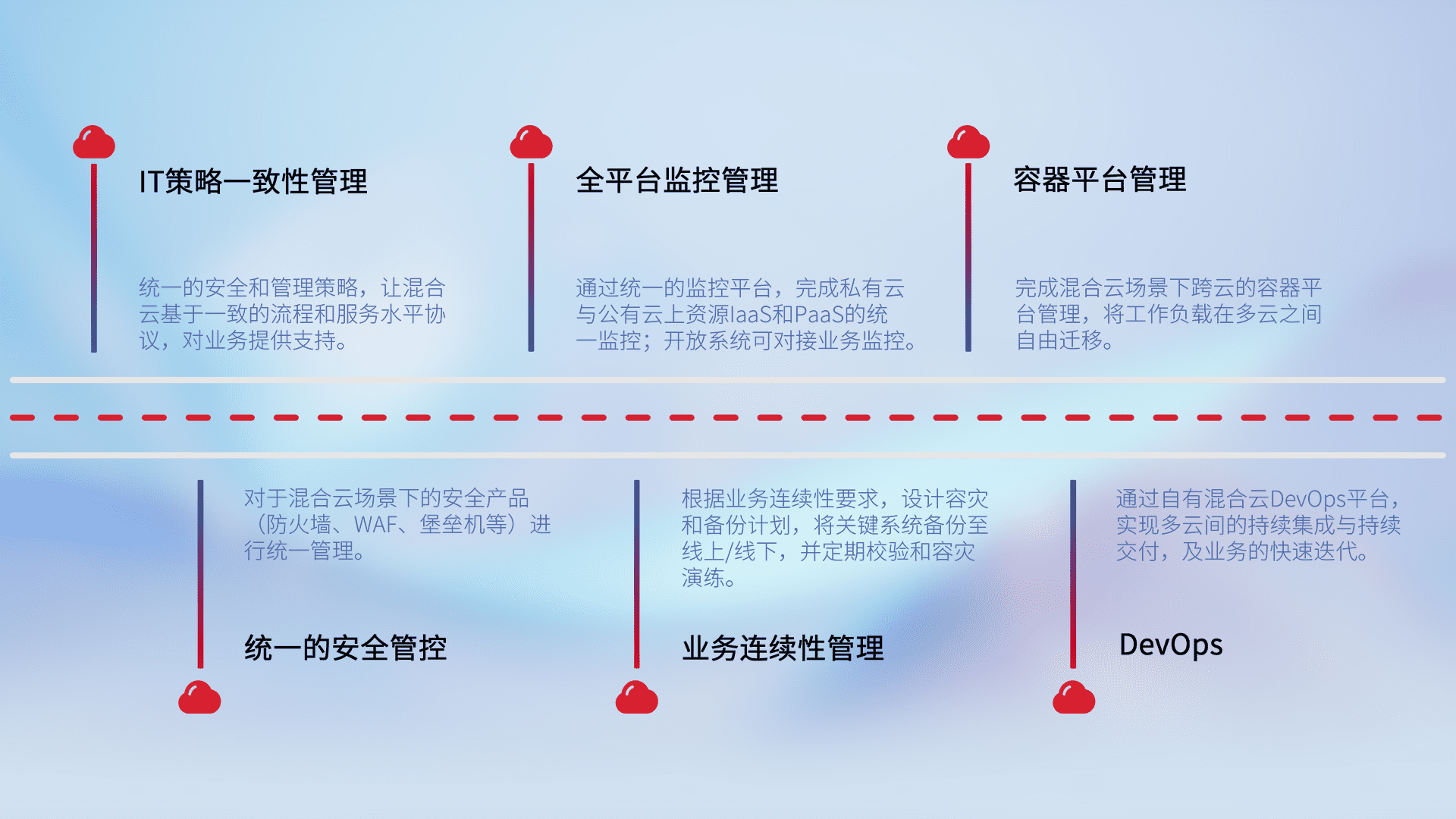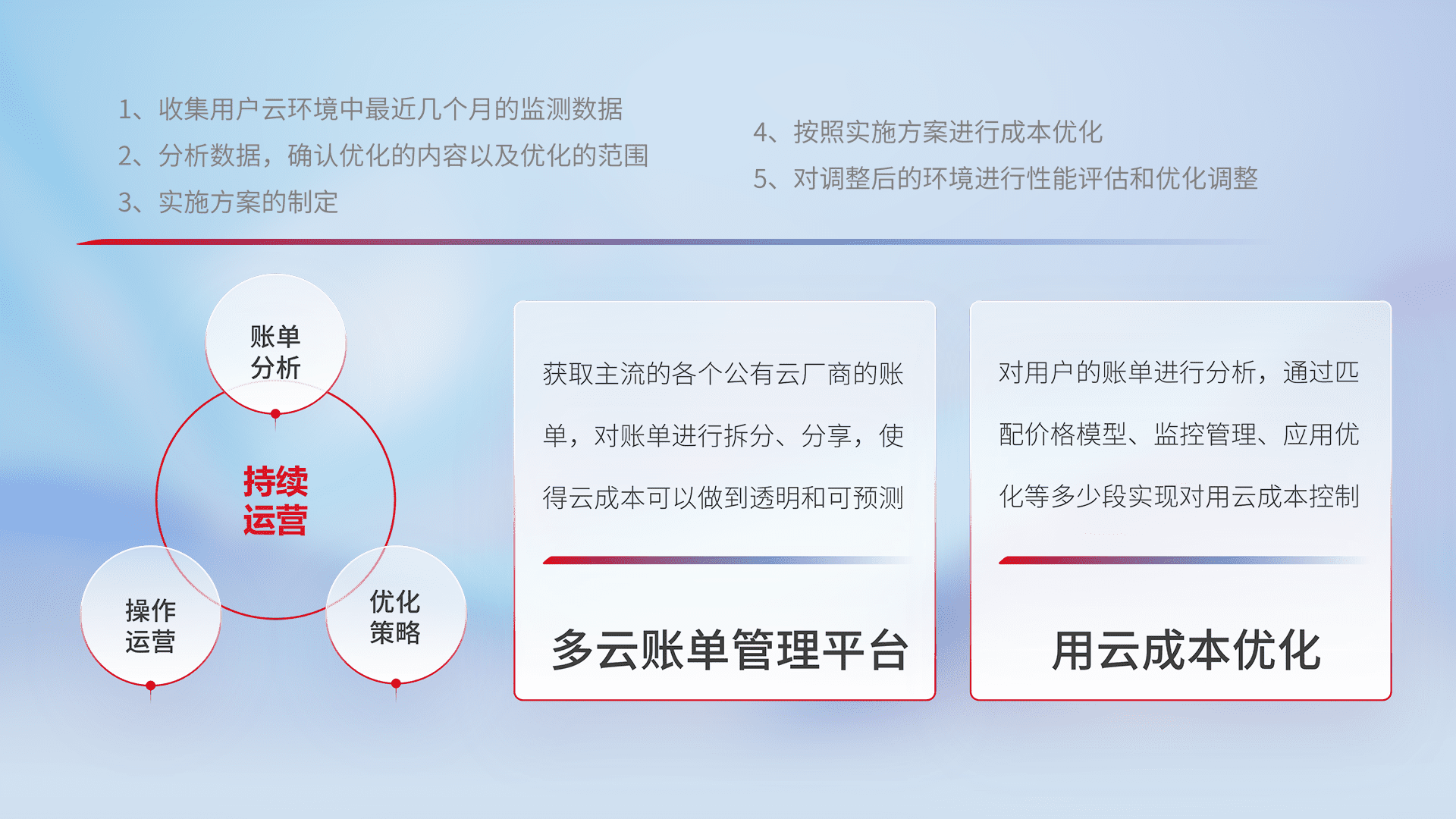 通过多云纳管,,以统一的资源数据模型把客户的云资源进行抽象和封装,,进而实现对多云资源的统一操作,,,保障云资源管理的可靠性、、、、稳定性与可用性。。。量身定制化运维内容,,配置、、、开发运维、、、补丁管理、、备份、、、监控、、、、认证和访问管理、、、审计和日常巡检等,,,,保障在用云过程中的可靠度,,,,稳定度以及高可用率。。