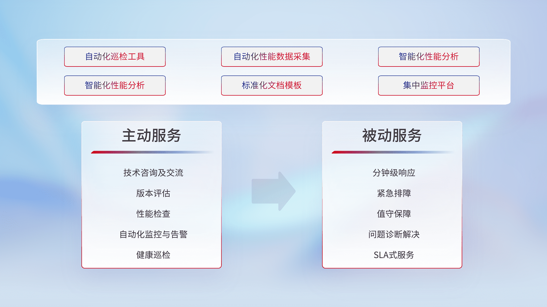 智能化工具和标准化文档,,,,保障服务质量,,提供主动服务(包含技术咨询、、、、版本评估、、性能检查、、自动化监控与告警、、、健康巡检)和被动服务包含(分钟级响应、、、、紧急排障、、、、值守保障、、、问题诊断解决、、SLA服务)。。。。
